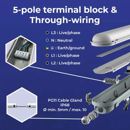 Descrizione Noxion Stagna LED Poseidon V3.0 65W 8450/9100lm - 830-865 CCT | 150cm - Cablaggio Entra/Esci (5x2.5mm2) - Dali Dimmerabile